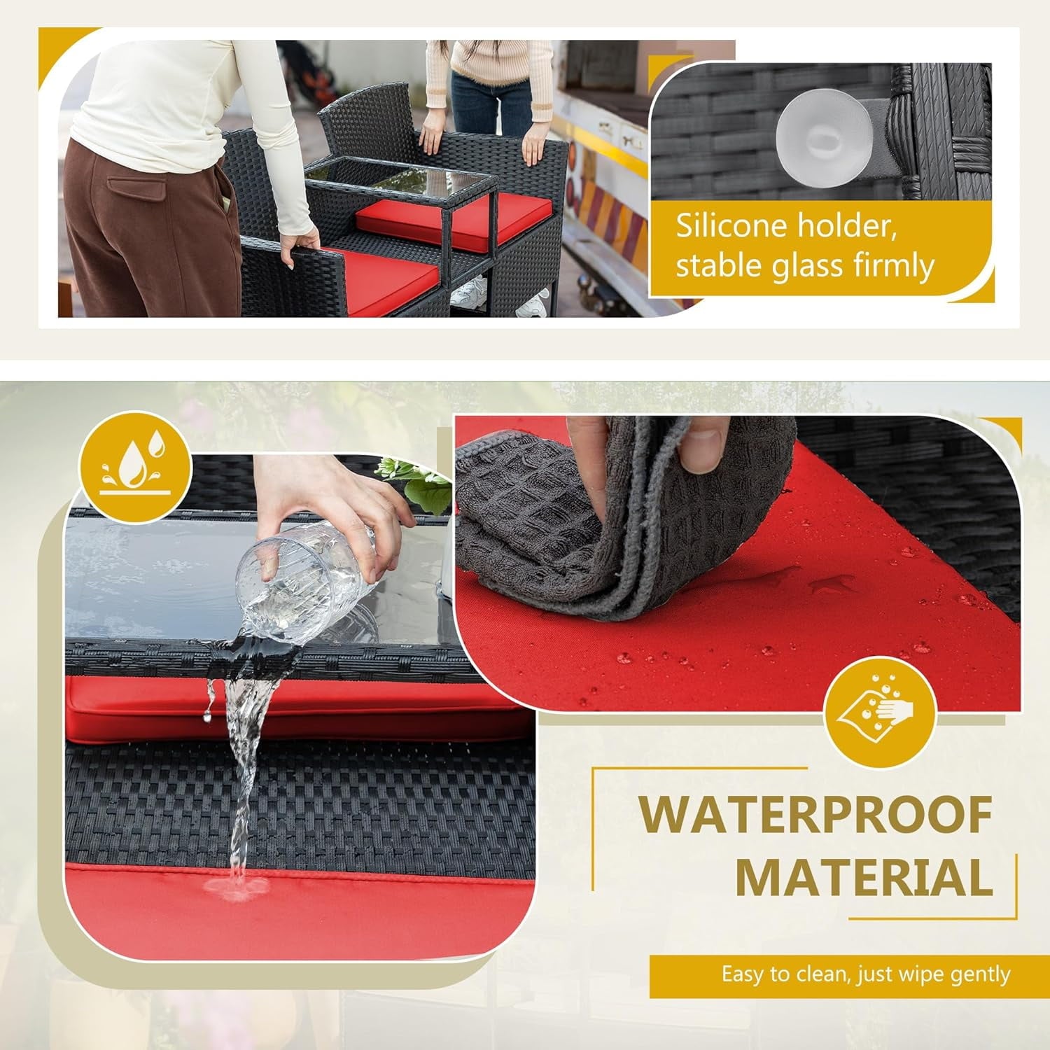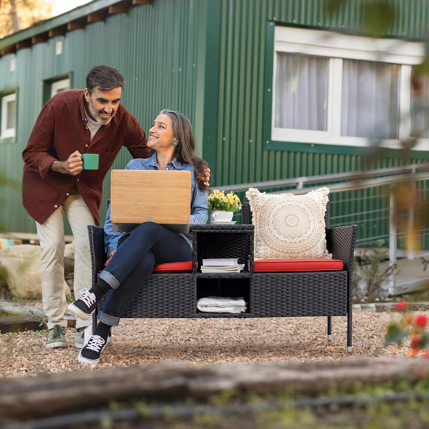 CRXX Outdoor Furniture Patio Loveseat Wicker 2-Seat with Built-in Table and Cushions Rattan Porch Chairs Bench for Balcony, Lawn, Backyard (Red)