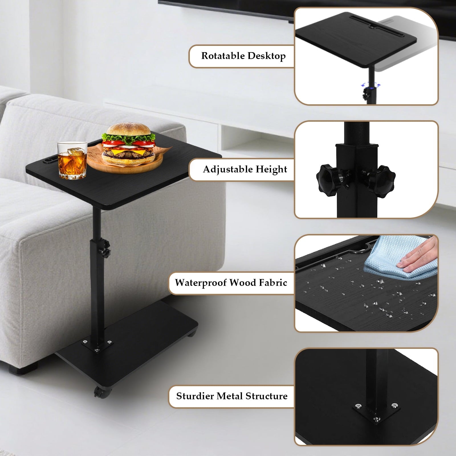 KFeng C-Shape Swivel End Table - Height Adjustable for Couch/Bed/Chair (Black,Wheel)
