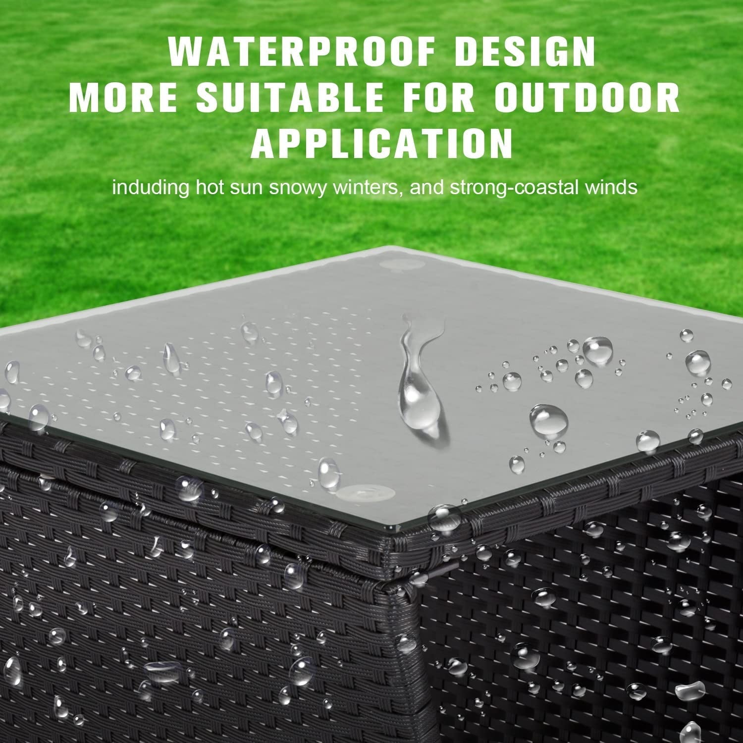-Material: iron, rust-resistant, PE Wicker Rattan, and Glass