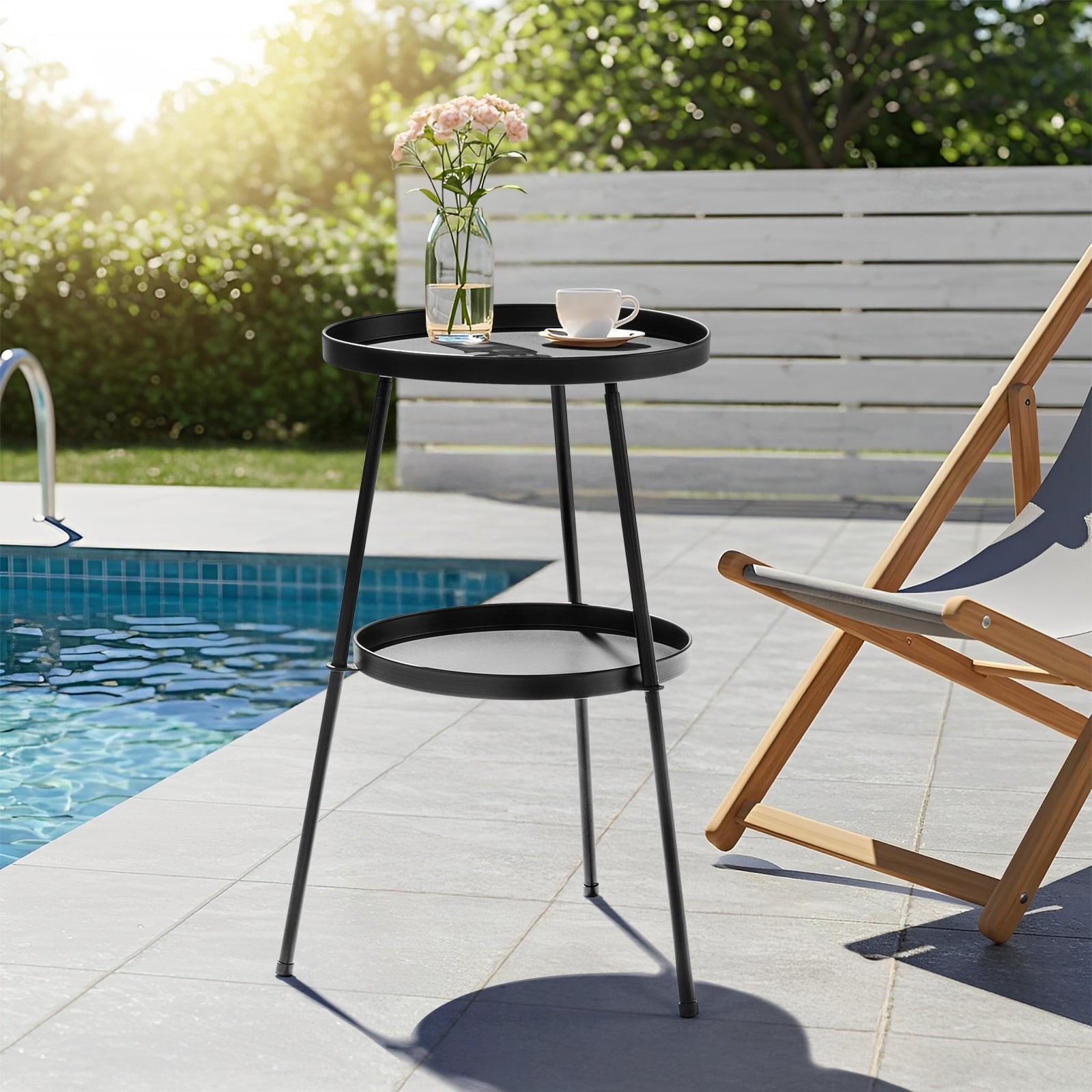 Enhance Your Space with the Ktaxon Round 2-Tier Side Table โ a compact, space-saving solution for indoor and outdoor use! This modern black metal side table features a two-tier design, perfect as a small coffee table, end table, or patio accent. With a 15.2-inch diameter, it fits seamlessly beside sofas, beds, or on balconies. The durable iron frame ensures stability, while the adjustable non-slip feet protect floors. Ideal for apartments, living rooms, and gardens, this round metal side table offers double storage for drinks, books, or dรฉcor. Weather-resistant and minimalist, it's a must-have for small-space living!