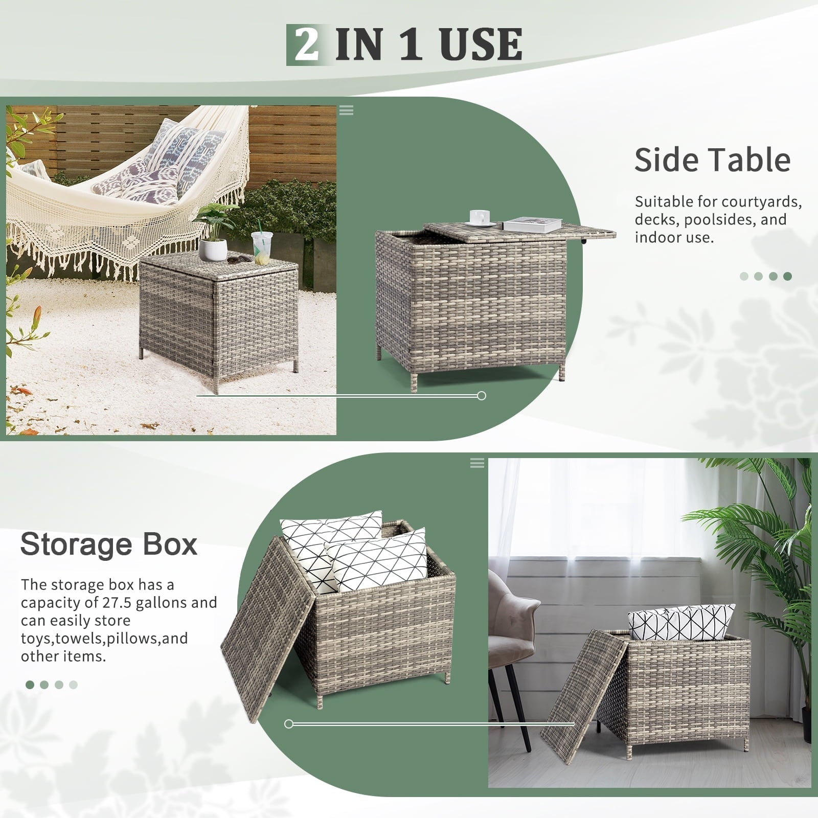 Ktaxon Wicker Side Table with Storage, 27 Galllon Square Ratten Storage Side Box Container for Furniture Covers, Toys and Gardening Tools, Gray