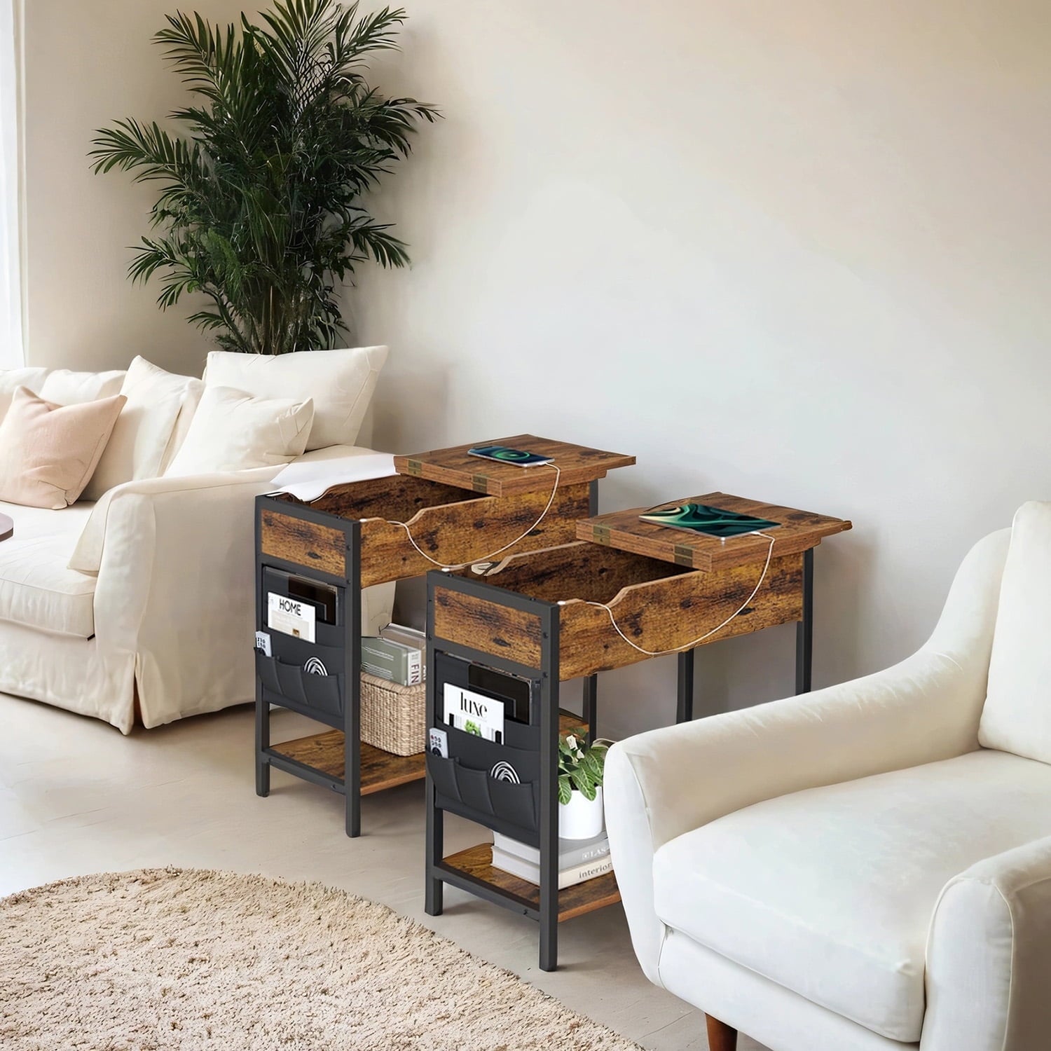 Upgrade your space with this functional 2-piece set of charging side tables that combine smart organization with modern convenience. Each table features a versatile charging station (2 AC outlets + 2 USB ports) with strategically spaced 4.9ft cords to power multiple devices simultaneously. The innovative design includes both open shelving and hidden flip-top storage, complemented by three sized fabric organizers (9.1' large, 9.1' medium, and small bottom bags) for perfect item categorization. Thoughtful details like cord management grooves and a side-mounted power strip maintain a clutter-free look. Measuring 23.6' tall, these rustic brown tables with black steel legs effortlessly blend into bedrooms, living rooms, or any tight space needing both style and function.Material: Steel Frame, Particleboard, Fabric BagSize of Each Table: 23.6βD x 12.4βW x 23.6βH (60 x 31.5 x 60 cm)Size of Power Strip: 2βD x 5.1'W (5 x 13 cm)Cord Length: 4.9 ft (150 cm)Weight of Each Table: 23.4 lb (10.6 kg)Max. Static Load of Each Table:Max. Static Load of Tabletop: 22 lb (10 kg)Max. Static Load of Storage Compartment: 22 lb (10 kg)Max. Static Load of Bottom Shelf: 33 lb (15 kg)