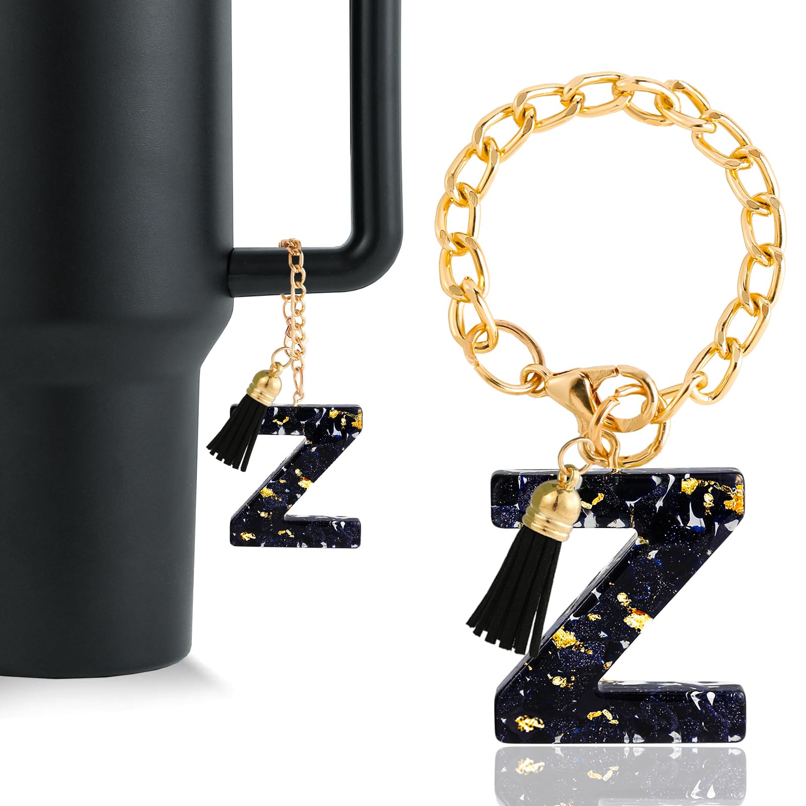 - Shining and Eyecatching Design: This initial keychain for stanley 30 oz or 40 oz is an eye catching fashion cup accessories, the letter is full of black golden sequins, making it a lot more elegant than the others. Super cute addition to your tumbler
