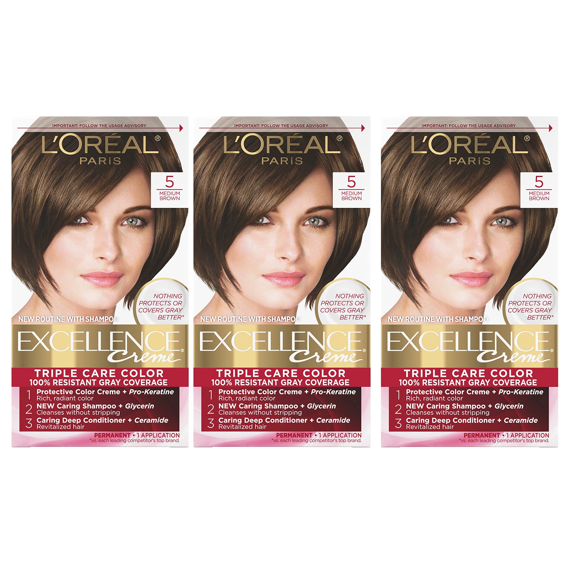 L'Oreal Paris Excellence Creme Permanent Hair Color, 5 Medium Brown, 100 percent Gray Coverage Hair Dye, Pack of 3
