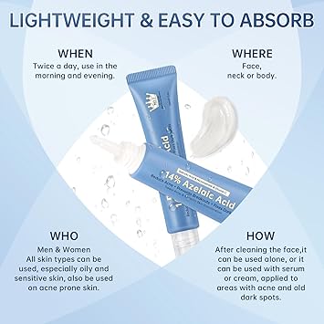- Effective Targets Acne: The azelaic acid cream, formulated with a powerful 14% azelaic acid booster, this advanced formula soothes irritation, reduces blemishes, acne and dark spots, helps unclog pores, improve skin and soothes facial redness