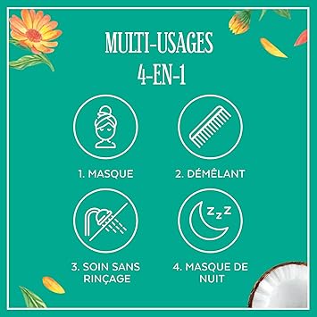 A healthy scalp is the basis for healthy hair. Discover our infusion range. Our authentic hydration recipe takes care of your scalp and hair. - infusion of calendula: mythical flower recognized for its protective and nourishing properties. - Coconut water: renowned for its moisturizing power. Le Petit Marseillais offers you its new 4-in-1 multi-user masks for optimal use all the expertise and effectiveness of our infusions in our multi-user masks for nourished, repaired and sublimated hair from the root to the end. at the peak! 4 possible uses: - mask in the shower - conditioner - care for ends without rinsing - night mask 4 benefits for: - intensely nourishing - detangling - protecting your ends - repairing all night.