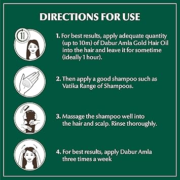 - DIRECTIONS FOR USE: Apply an adequate quantity (up to 10ml) of Dabur Amla Hair Oil into the hair and leave it for some time (ideally 1 hour). Then apply a good shampoo such as Vatika Ayurveda range of shampoos. Massage the shampoo well into the hair and scalp and rinse thoroughly, followed by Vatika Ayurveda range of conditioners. Apply Dabur Amla Hair Oil three times a week. For best results, use our premium range of Vatika Ayurveda products.